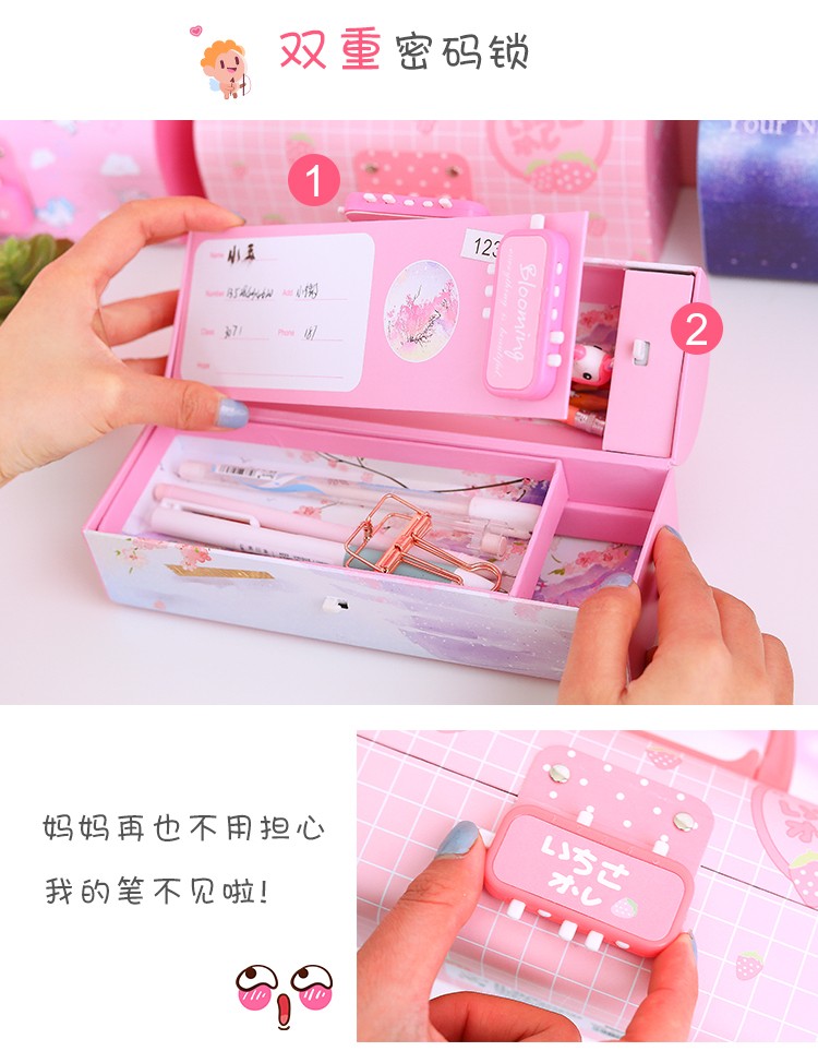 咔巴熊小学生创意多功能文具盒双密码锁收纳盒大容量可爱笔袋儿童手提多层小清新铅笔盒幼儿园男女孩抖音同款 当时盛开--樱花